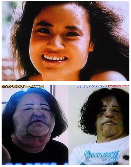 A Korean singer, Hang Mioku, had her first plastic surgery when she was 28. She soon became addicted and got a series of procedures performed on her face, which eventually led to it becoming enlarged and disfigured. Later, surgeons refused to perform any more cosmetic procedures on her, and suggested that her addiction could be indicative of a psychological disorder. She eventually found a doctor who was willing to give her silicone injects and even gave her a syringe and silicone to self-inject. When she ran out of silicone, she started injecting cooking oil into her face, which resulted in her face becoming abnormally large, scarred, and disfigured, despite surgical attempts to rectify the defects (The Telegraph, 2008).